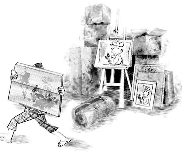 כַּאֲשֶׁר הִגִיעָה גְבֶרֶת רוֹזָה, מָצְאָה אֶת הַשַׁעַר הֶחָלוּד פָּתוּחַ. הַצַיָר גַבְרִיאֵל גַבְרָא כְּבָר הִסְפִּיק לְהַעֲבִיר אֶת כָּל חֲפָצָיו לִמְכוֹנִיתוֹ. הוּא זָרַק אוֹתָם שָׁם בְּאִי סֵדֶר וּבְלִי לֶאֱרוֹז בְּקַרְטוֹנִים.