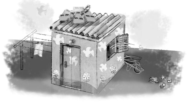 ת הַחַדְרוֹן שֶׁבּוֹ גָר הַמְשׁוֹרֵר בָּנְתָה זֶהָבָה, הַבַּת שֶׁל גְבֶרֶת מַזָל. בְּעֶצֶם, הִיא סִרְטְטָה אֶת הַתוֹכְנִית וּשְׁנֵי פּוֹעֲלִים בָּנוּ תַחַת הַשְׁגָחָתָהּ. אַךְ בְּמוֹ יָדֶיהָ צָבְעָה אֶת הַקִירוֹת בִּפְנִים בְּצֶבַע לִימוֹן. וּבַחוּץ צָבְעָה בְּכָחוֹל שֶׁל שָׁמַיִם וְצִיְרָה בְּכִישָׁרוֹן רַב אֶת הַיוֹנִים הַלְבָנוֹת. גַם אֶת הַדֶלֶת הַכְּחוּלָה קִישְׁטָה בִּשְׁתֵי יוֹנִים, אַחַת קְטָנָה כְּאִילוּ עָפָה רָחוֹק. הַחַדְרוֹן נִרְאָה כְּמוֹ בַּיִת מֵאַגָדָה אוֹ מִשִׁיר.